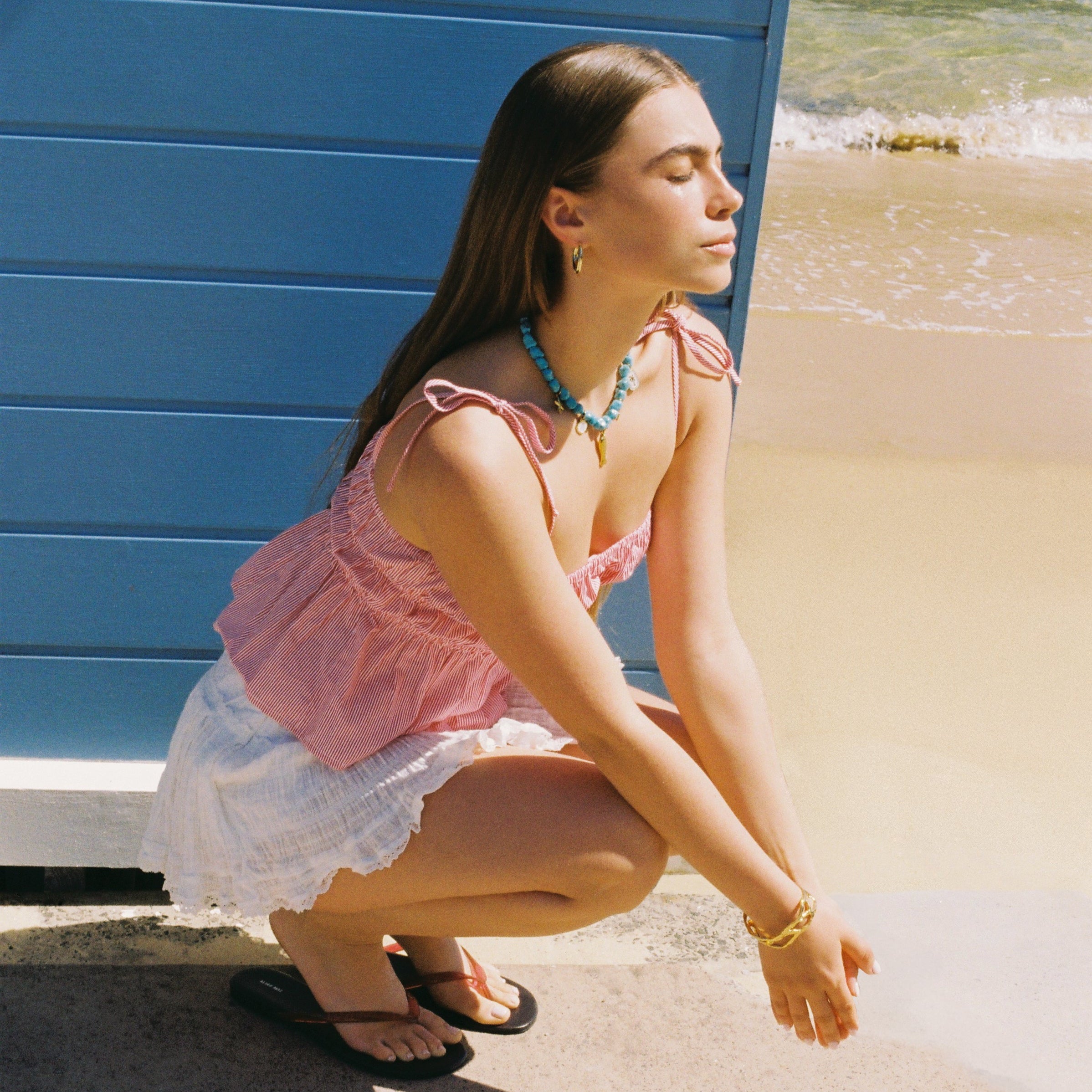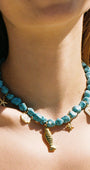 The Bells Necklace is your ultimate ticket to endless summer, featuring chunky, vibrant natural turquoise beads that perfectly capture the colour of the clearest ocean water. At a versatile with a extender, it sits perfectly at the collarbone. Plus, it's totally waterproof and tarnish-free—because you should never have to take off your vacation vibes.