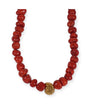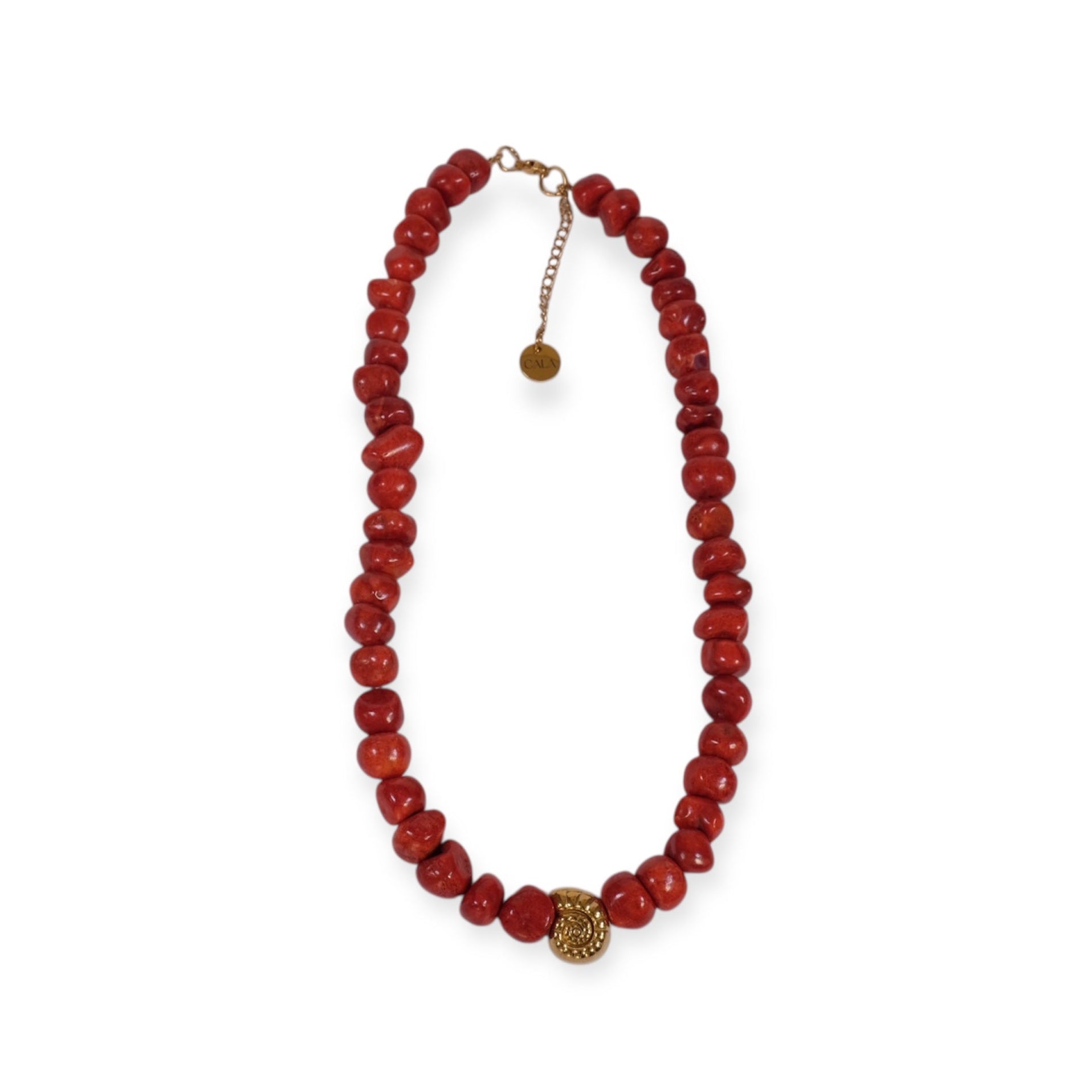 The Miramar Necklace is a bold expression of warm sunsets and coastal escapes. Crafted with rich red ceramic beads and finished with a gold-toned spiral shell charm, this handcrafted piece channels earthy elegance with a seaside twist.