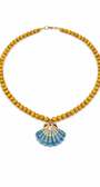 The Nara Necklace is a vibrant ode to sunny days and ocean vibes. Featuring a strand of bright yellow ceramic beads and a striking blue ceramic shell pendant, this handcrafted piece brings the essence of coastal charm to your everyday style.